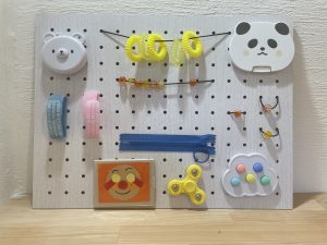 今回作ったビジーボードは指先の発達につながるような押す・摘まむ・引っ張るが出来るものを選びました。