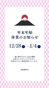 お知らせとなりますが、マミーズの年末年始休業は以下の通りです。